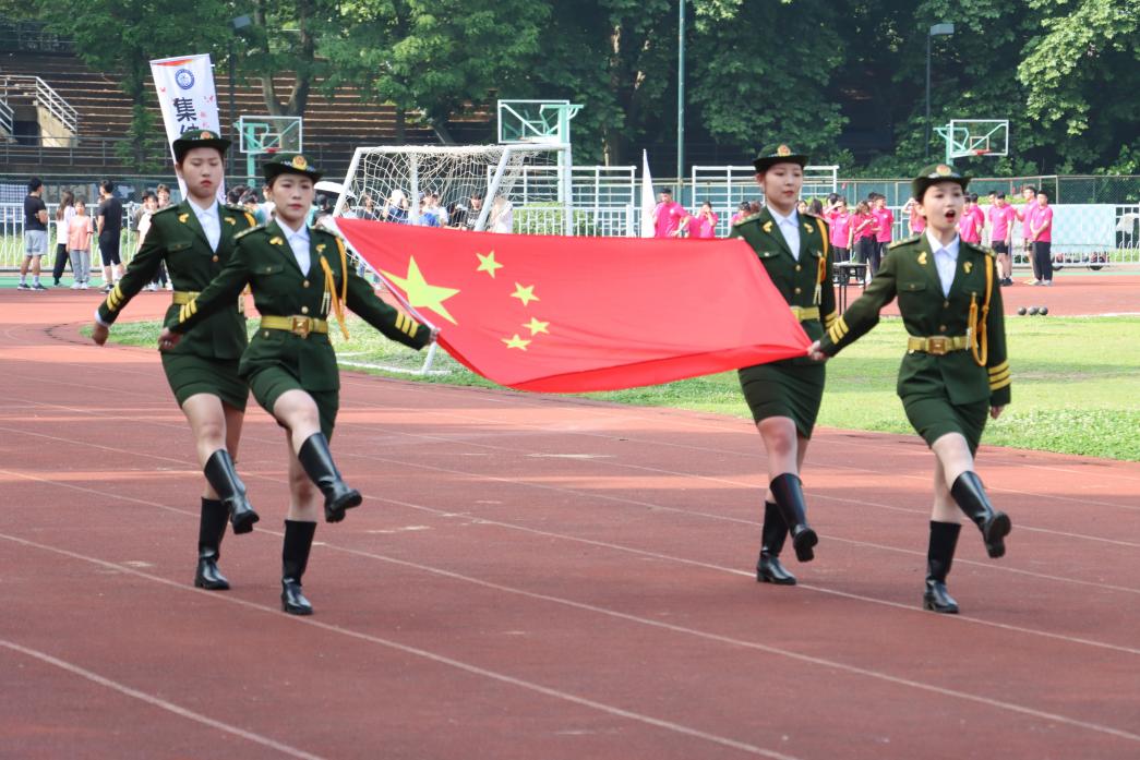 伴随铿锵的音乐,各方阵迈着整齐的步伐入场,顺序依次是国旗队、魏心怡带领的运动健康学院方阵、刘子恒带领武术与艺术学院方阵、万博文带领的研究生部方阵和李明带领的体育教育与人文学院方阵。