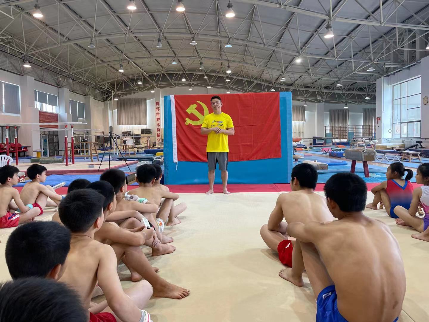 体操队领队黄旭为所有的运动员讲述了中国共产党在领导全国各族人民推翻三座大山,进行社会主义革命、建设过程中涌现出来的英雄人物,尤其是共和国勋章获得者、国家最高科学技术奖获得者、杂交水稻之父袁隆平的励志故事。通过故事让小运动员进一步了解到,袁老一生只做一件事,数十年如一日,袁老用自己的坚持和心血,为做好“解决亿万人吃饭的问题”这件事竭尽全力、付出所有。黄领队鼓励运动员学习袁老敢于攻坚克难的责任意识、无私忘我的奉献精神、淡泊名利的高尚品格;希望大家不忘过去的艰难岁月、珍惜今天的美好生活,从节约粮食做起,养成自我管理的好习惯,为将来走上成功的体育路、人生路奠定扎实的基础。