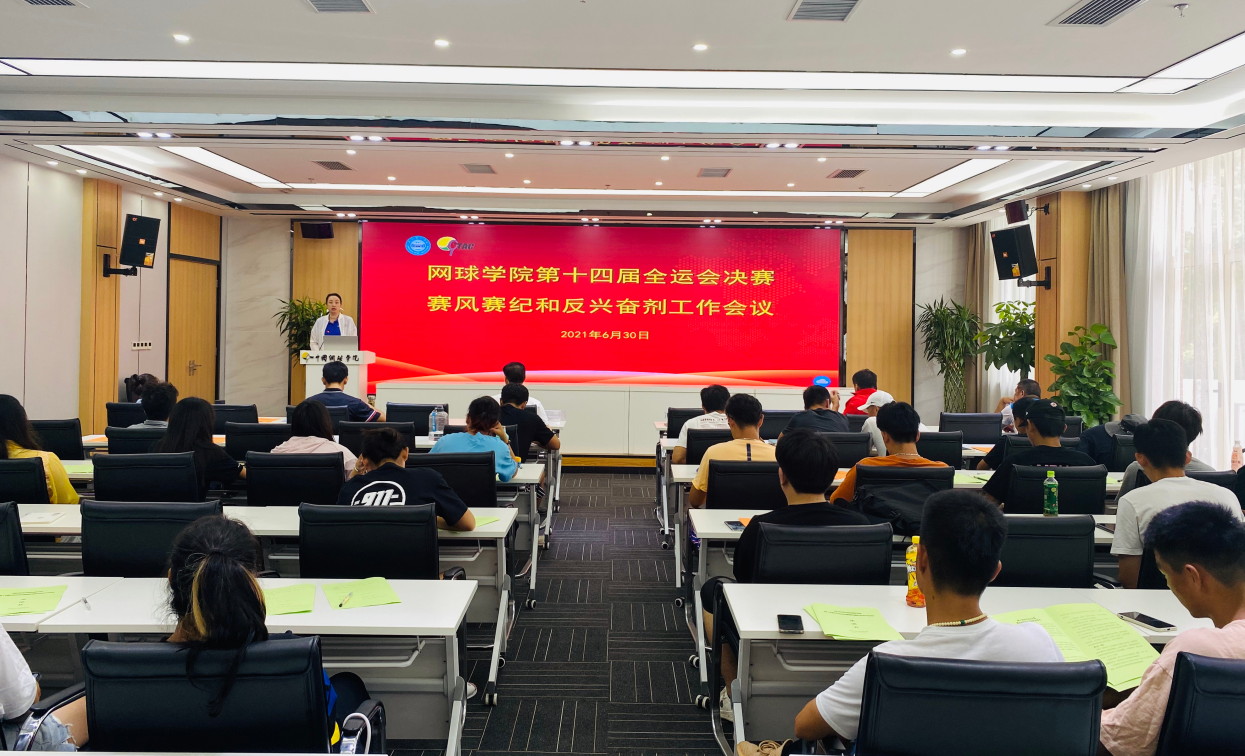 6月30日下午,网球学院召开第十四届全运会决赛赛风赛纪和反兴奋剂工作会议,网球学院全体管理干部、网球队全体教练员、体能教练、运动员、队医以及拟赴全运会赛区的服务保障人员参加会议。会议由鲍勤院长主持。
