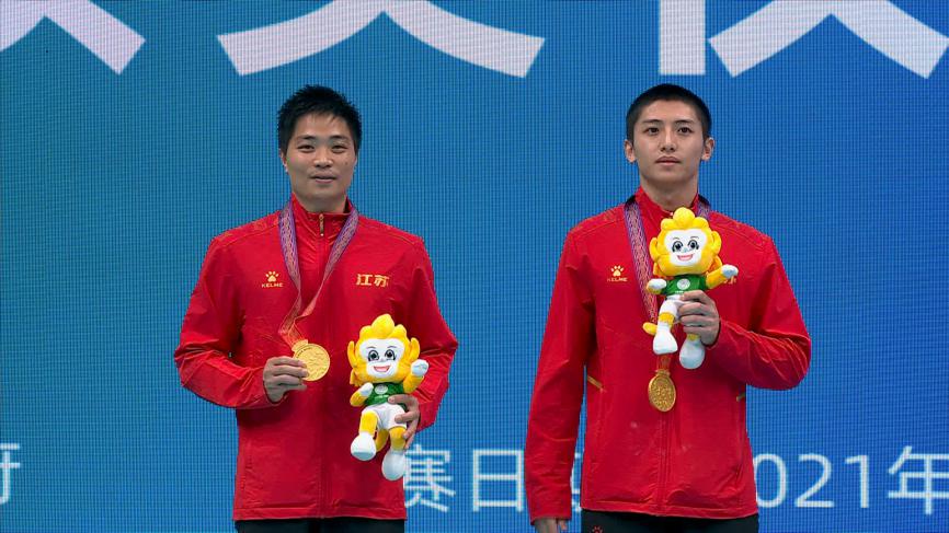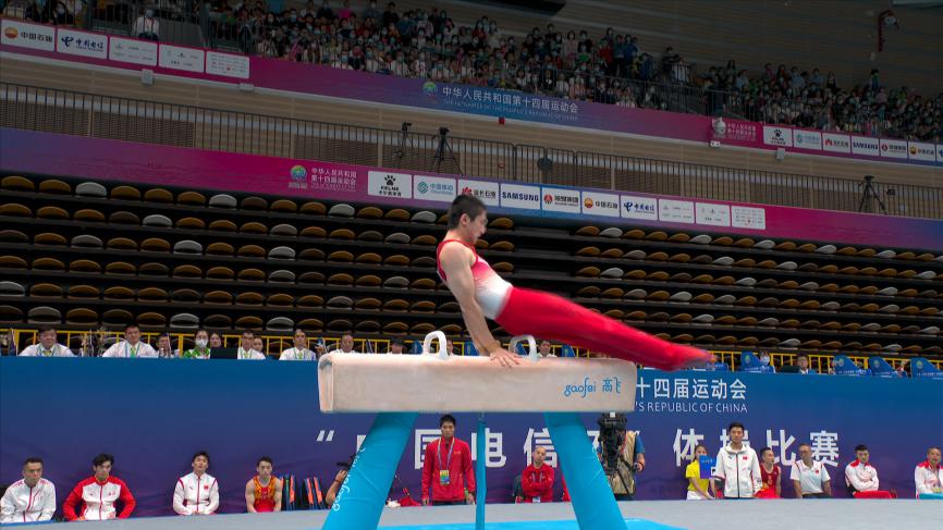 9月25日下午,第十四届全运会体操男子鞍马决赛在陕西奥体中心体育馆举行。上届全运会鞍马冠军、江苏选手翁浩以15.400分成功卫冕。他的队友孙炜以14.960分获得银牌,四川选手邹敬园以14.580分获得铜牌。
