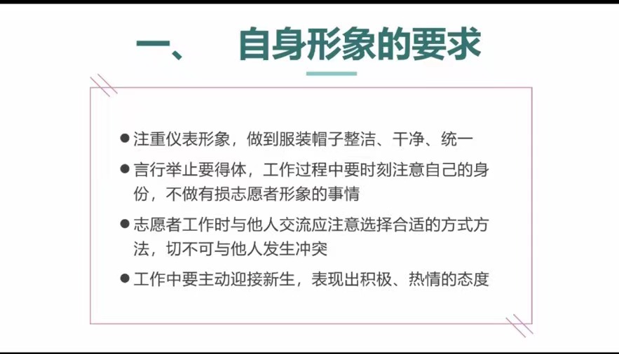 沈梦从自身形象及岗位职责两大方面,详细讲解了迎新志愿服务当天的具体要求。对迎新志愿服务涉及到的各个环节进行了细致安排,把工作任务安排到每一位志愿者身上,定岗定责,真正把细节落到实处。同时也要求全体志愿者在迎新工作的期间,也要做好个人防护工作,共同迎接新生的到来。