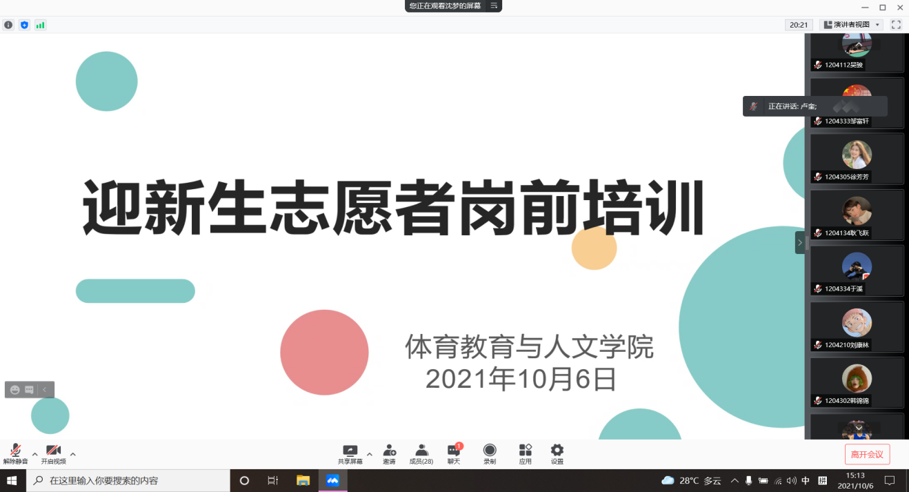 梧桐遍满金陵城,又是一年迎新时。为认真做好学院迎新工作,确保21级新生顺利完成报到,10月6日下午,体育教育与人文学院在线上召开了迎新生志愿者岗前培训大会。体育教育与人文学院党总支副书记卢奎、辅导员沈梦及全体迎新生志愿者参加会议,会议由学院团委副书记宋树梅主持。
