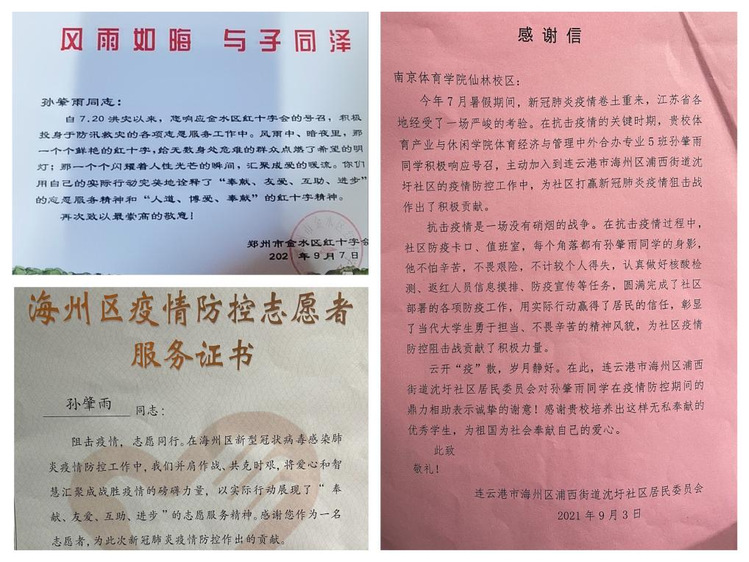 “疫情爆发、洪水突袭,我希望我的一点微薄力量能为有需要的人民、地区做一些力所能及的事情”。正值新生报到之际,PA视讯集团入口体育产业与休闲学院获悉,2021级体育经济与管理(中外合作)5班新生孙肇雨,暑期参与了郑州抗洪重建工作和家乡连云港的防疫志愿服务活动。