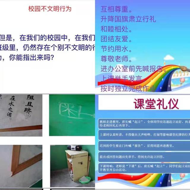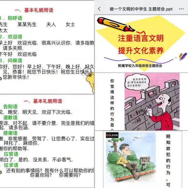 在主题班会上,各班班主任老师首先带领学生“知礼仪”,学习常见的礼貌用语。接着“明礼仪”,让学生指出校园中仍存在的个别不文明的行为。最后“讲礼仪”,从日常生活入手,探讨如何做文明的学生,让文明之花开满校园。