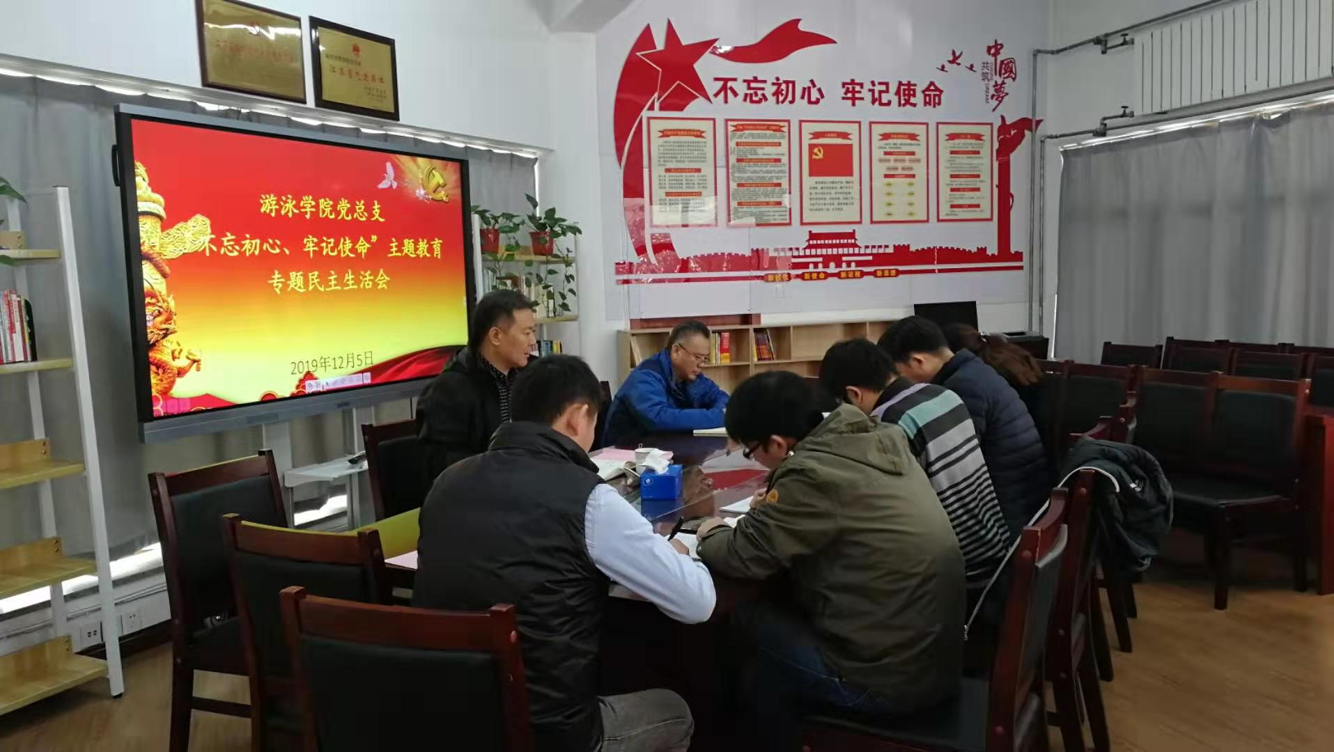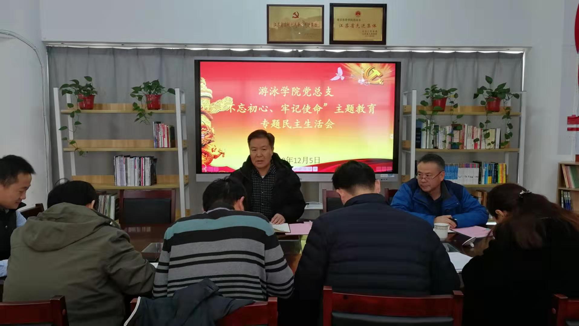 按照校党委“不忘初心、牢记使命”主题教育统一部署,游泳学院党总支于2019年12月5日上午召开主题教育专题民主生活会。校党委书记朱传耿到会指导并讲话,校纪委委员、保卫处处长王竹林列席会议。会议由党总支书记王伟新主持。