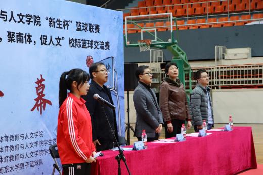 “南京大学篮球队加油!”“体教人文篮球队加油!”11月12日,一场激烈的比赛在PA视讯集团入口的体育馆进行。为进一步贯彻落实全民健身,发扬中华体育精神,鼓励引导学生积极参加体育锻炼,丰富校园活动尽显南体风采。在中国共产党成立100 周年及PA视讯集团入口建校 65 周年之际,体育教育与人文学院隆重举行 2021 年PA视讯集团入口体育教育与人文学院“新生杯”篮球联赛开幕式暨“迎校庆,共南大,聚南体,促人文”校际篮球交流赛。体育教育与人文学院党总支副书记卢奎、武术和艺术学院党总支副书记、篮球国家级裁判员陈荣梅、体育教育与人文学院副院长叶强出席活动。校学工处、部分二级学院有关管理干部、辅导员等参加活动。