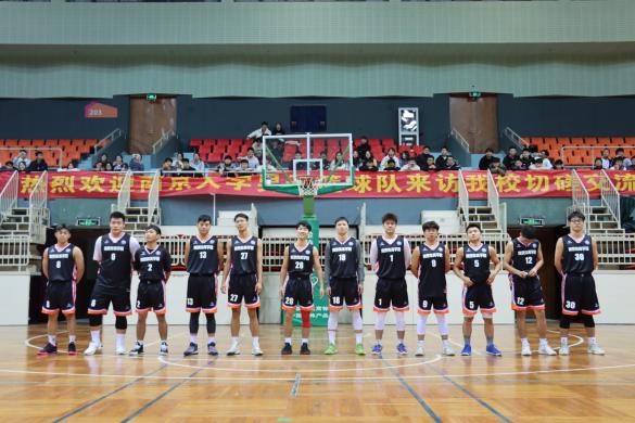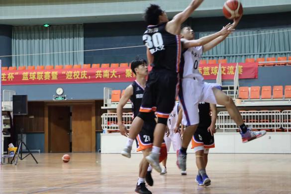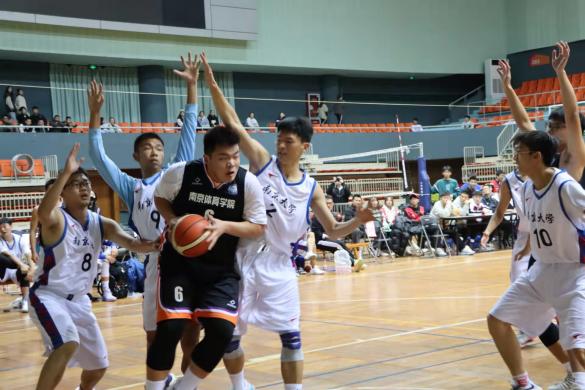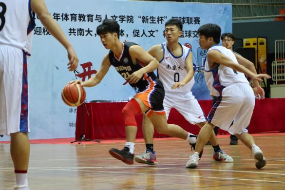 高高抛向空中的球拉开了赛事帷幕,现场的气氛急剧攀升,比赛的双方很快进入角逐的状态,展开激烈的进攻。篮球赛一共分四场,每场10分钟。体教人文篮球队用各种各样的篮球技巧和精准的投篮为队伍贡献了一分又一分,在前两场比赛中占据主动权,以20:13的比分领先南京大学篮球队。第三场,比赛进入相持阶段,南京大学篮球队在中场休息期间经过战术讨论、替换人员,随着一个又一个的篮球以优美的弧线投进篮筐,以4分的差距领先体教人文篮球队。第四场,比赛进入白热化阶段,赛场上战火燃烧,双方队员熟练地运球、传球,积极地拼抢、精准地投篮,场下观众情绪激昂,但是随着南京大学篮球队多个精准的三分球,最终体教人文篮球队以39:43的比分落后南京大学篮球队。赛后,双方队员相互交流,分享经验,相互学习。