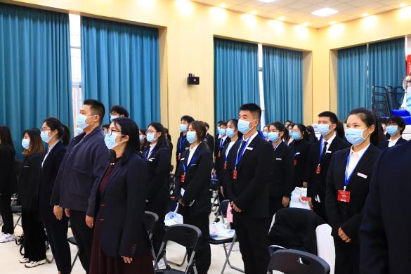 视频播放完毕后,主持人王悦蓉同学汇报代表人数和到场情况。到会人数符合大会章程,主持人宣布大会开幕,全体起立奏唱国歌。