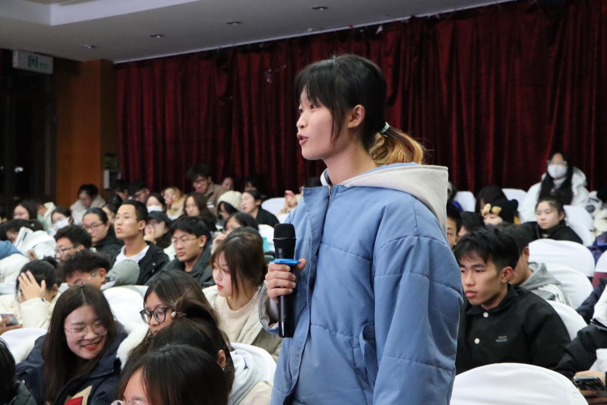 讲座后,同学们受益匪浅、踊跃提问。袁教授就如何以语言为载体传播中华文化等问题做出细致解答,并为大学生如何提高英语水平指明了方向。