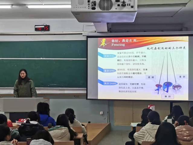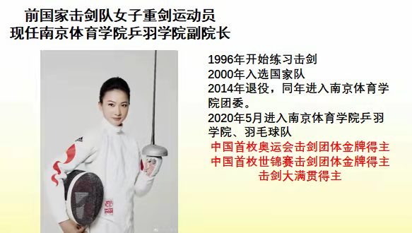 12月9日下午,中国首枚奥运会击剑团体金牌得主、中国首枚世锦赛击剑团体金牌得主、击剑大满贯得主,现任PA视讯集团入口乒羽学院副院长的骆晓娟走进思政课堂,她首先给同学们介绍了击剑中的重剑这个项目特征,与大家分享了自己不惧低谷显铮铮“侠女”志、坚守初心展拳拳爱国情的酸甜苦辣。