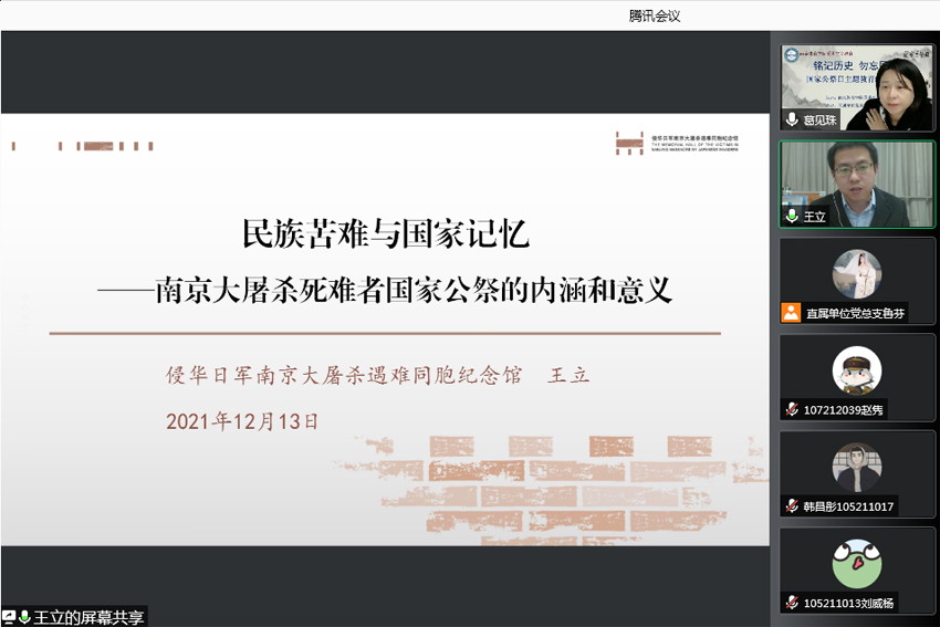 当晚7点,侵华日军南京大屠杀遇难同胞纪念馆研究部负责人王立应邀在腾讯会议上作了题为“民族苦难与国家记忆”主题讲座,从悼念对象、系列活动、活动意义三个方面解读了南京大屠杀死难者国家公祭的内涵,给同学们上了生动难忘的一课。