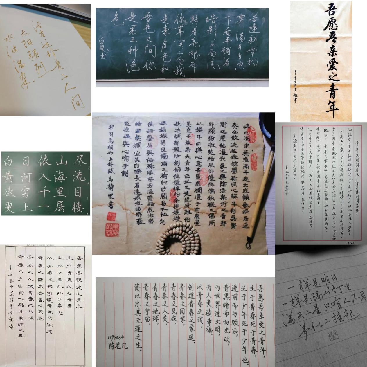 本次比赛采用线上投稿方式,学院师生积极参与本次活动,用心书写每一笔画,用情传递每一句话,上交了一份份各具特色的作品。其中,硬笔字劲隽美,粉笔字工整清秀,毛笔字遒劲流畅,配音作品字正腔圆、声情并茂,将对党的感恩情怀化作一个个字符与音节,抒发对党和国家的满腔热忱。