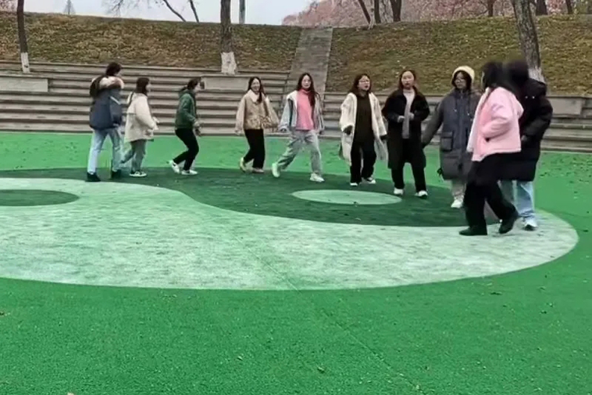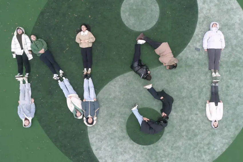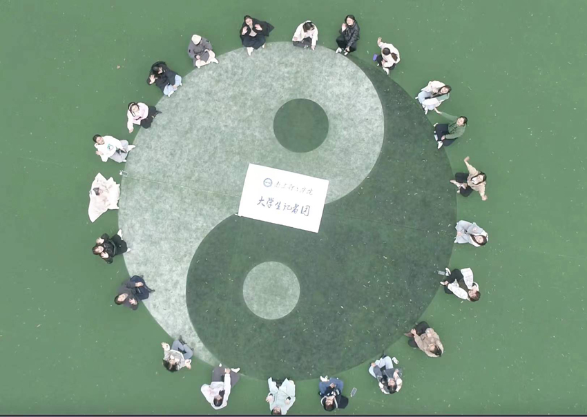 紧接着,大家根据指挥躺在草坪上摆出“NSI”形状,无人机盘旋而上在空中记录下每一张笑颜。最后,大家来到国术场背面的台阶上一同喊出记者团的口号。