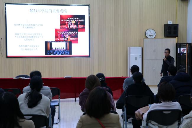 此外,王凯向全体教师梳理并展示了2021年学院发展建设所取得的重要成绩,包括:体育教育国赛获得一等奖;新闻专业获评新闻与传播硕士专业学位授权点;体育传媒产业成立及体育传媒产业发展高质量论坛举办;2021年第九届中国体育科学学会科学技术奖三等奖;2021年度江苏省高等学校科学技术研究成果奖三等奖;江苏省挑战杯三等奖等。他对全体教师一年里所做出的成绩表示充分的肯定,并希望在未来一年再接再厉!