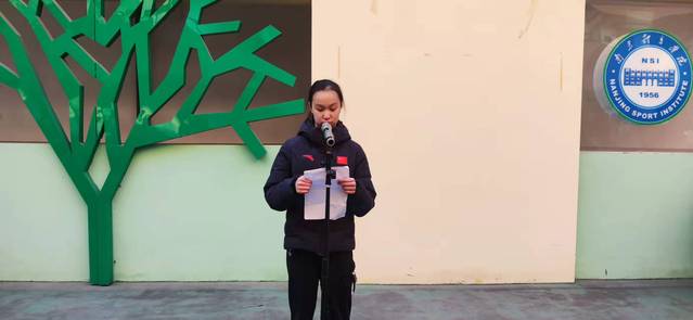两名升旗手作为学生运动员代表发表讲话。花游队金彦晓从规矩的重要性谈起,强调遵纪守法是每个学生必须遵守的行为准则,提倡运动员学生从努力学习各种法律法规、遵守校队的各种规章制度,不争强好胜、避免和别人发生冲突,训练时不做教练不允许的事四方面做起,成为遵纪守法的好少年。