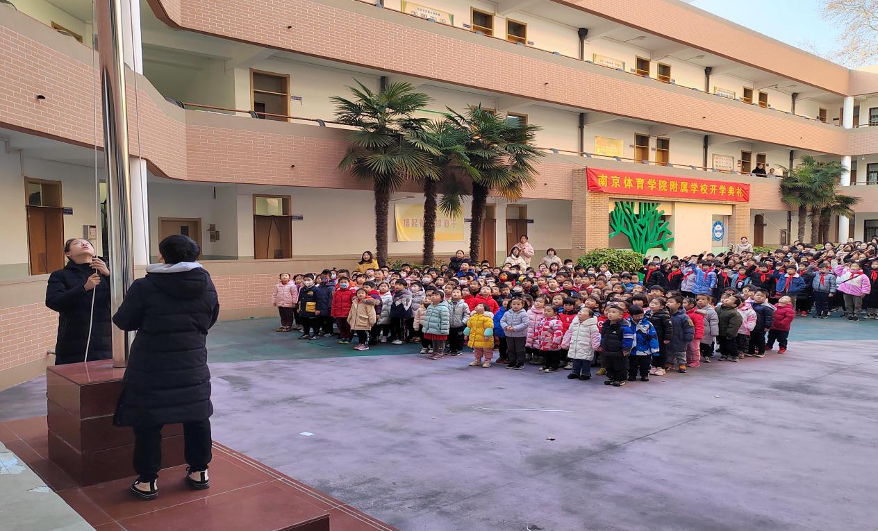 一大早,全体幼儿准时入园,在老师的组织下,个个精神抖擞排着整齐的队伍来到了附属学校的操场上等待着升旗仪式的开始。此次升旗仪式是由两位小运动员担当升旗手,当看到庄严的五星红旗冉冉升起的时候,少先队员们都向国旗致敬行队礼,幼儿园的小朋友们也认真安静的行注目礼。升旗仪式之后,幼儿园小朋友和附属学校的哥哥姐姐们一起聆听了学生代表发言及附属学校领导讲话,在开学典礼中,全体师生深切感受到了作为南体人的自豪。仪式上附属学校校长吴建华的讲话,也更加坚定了同学们认真学习、刻苦训练为祖国增光的决心。