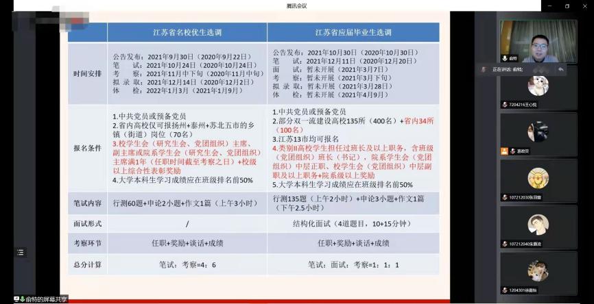 为进一步提高学生干部的思想政治素养,坚定理想信念,锤炼忠诚干净担当的政治品格,2月25日,体育教育与人文学院特邀请省学联驻会主席俞特(2020-2021年度)做“争做新时代的优秀学生骨干”的主题讲座,诠释新时代优秀骨干的内涵,分享选调生考试的相关经验。体育教育与人文学院19级学生、各学生组织学生干部参会。会议由学生王悦蓉主持。