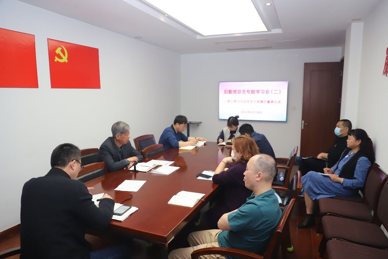3月14日上午,后勤党总支召开专题学习会传达学习《深入学习习近平关于体育的重要论述》,后勤党总支委员、处级干部、党支部书记及各科室负责人参加会议。