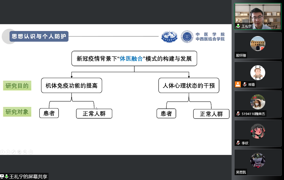 王礼宁博士以“中西医结合视野下的抗疫防线构筑”为主题进行讲述,对新冠肺炎病毒的情况进行了概述,并从新冠肺炎的传播途径和预防措施讲起,结合中西医结合抗疫的特色,重点从增强思想认识与个人防护等角度,专业而系统地进行了讲解,为同学们开展了一堂生动精彩的知识科普讲座。
