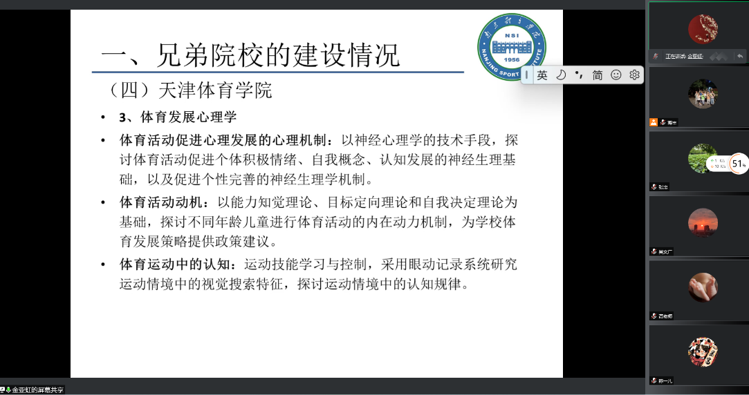 会议开始,金亚虹教授从兄弟院校体育运动心理学研究生招生和培养方向、PA视讯体育运动心理学相关师资建设情况及下一阶段工作等方面向与会人员进行了介绍。通过与兄弟院校、尤其是全国排名靠前的几所体育院校的比较,逐一分析了PA视讯在体育运动心理学科建设上的优势与劣势。随后,与会教师纷纷发表了自己的看法。