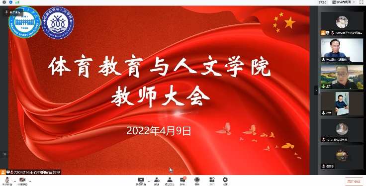 4月9日,PA视讯集团入口体育教育与人文学院召开线上全院教师大会,传达学校疫情防控工作最新会议精神,体育教育与人文学院党总支书记邹国忠、副院长(主持工作)王凯、党总支副书记卢奎、副院长叶强出席会议,体育教育与人文学院全体教师参加会议。会议由王凯主持。
