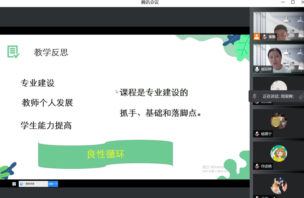 第一环节是一流课程申报的成功经验,此环节由周亚婷老师进行分享。周老师从申报目标,申报中遇到的问题及教师需要做哪些工作,在教学过程中的反思,如何建设专业团队等方面进行讲述。