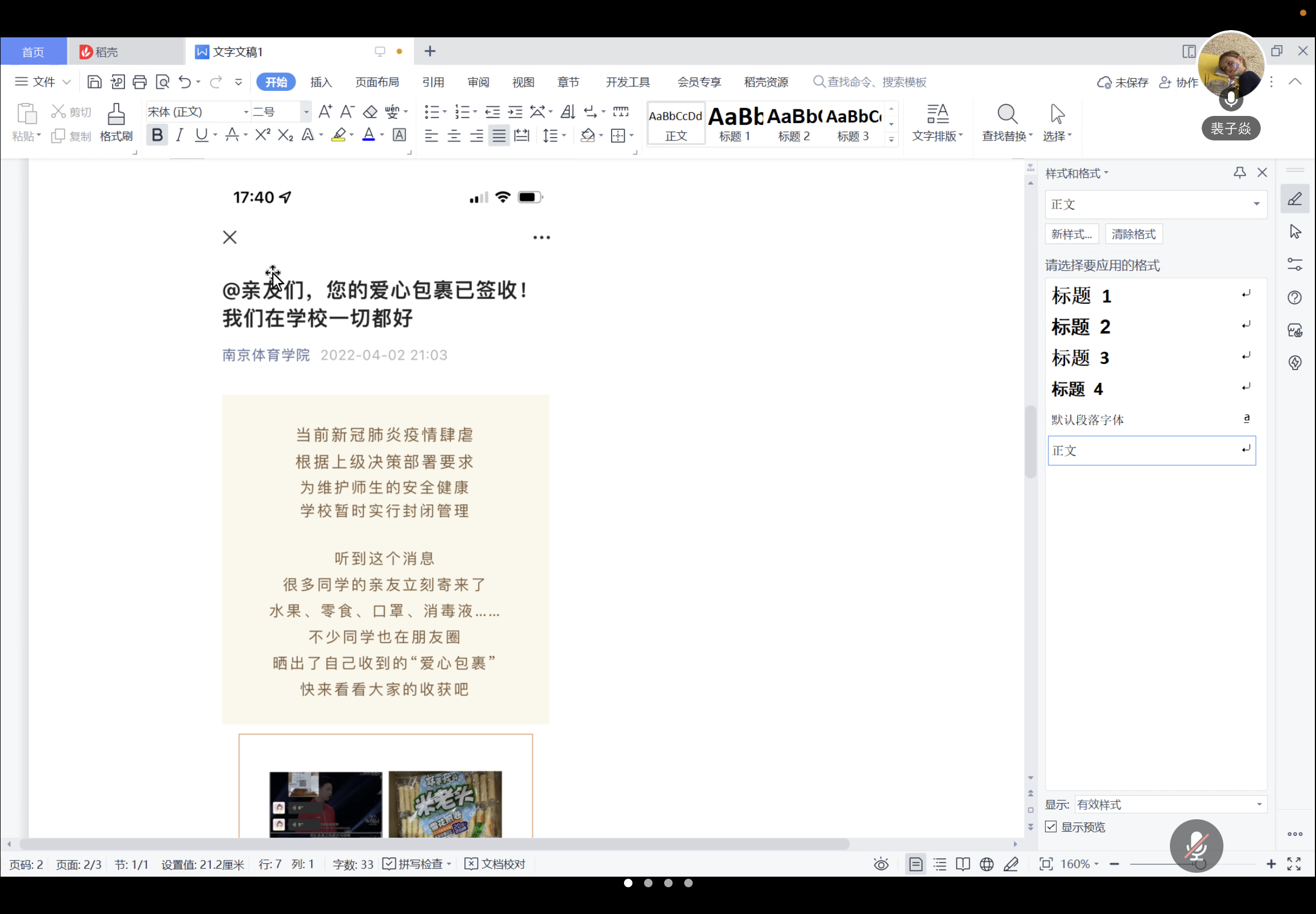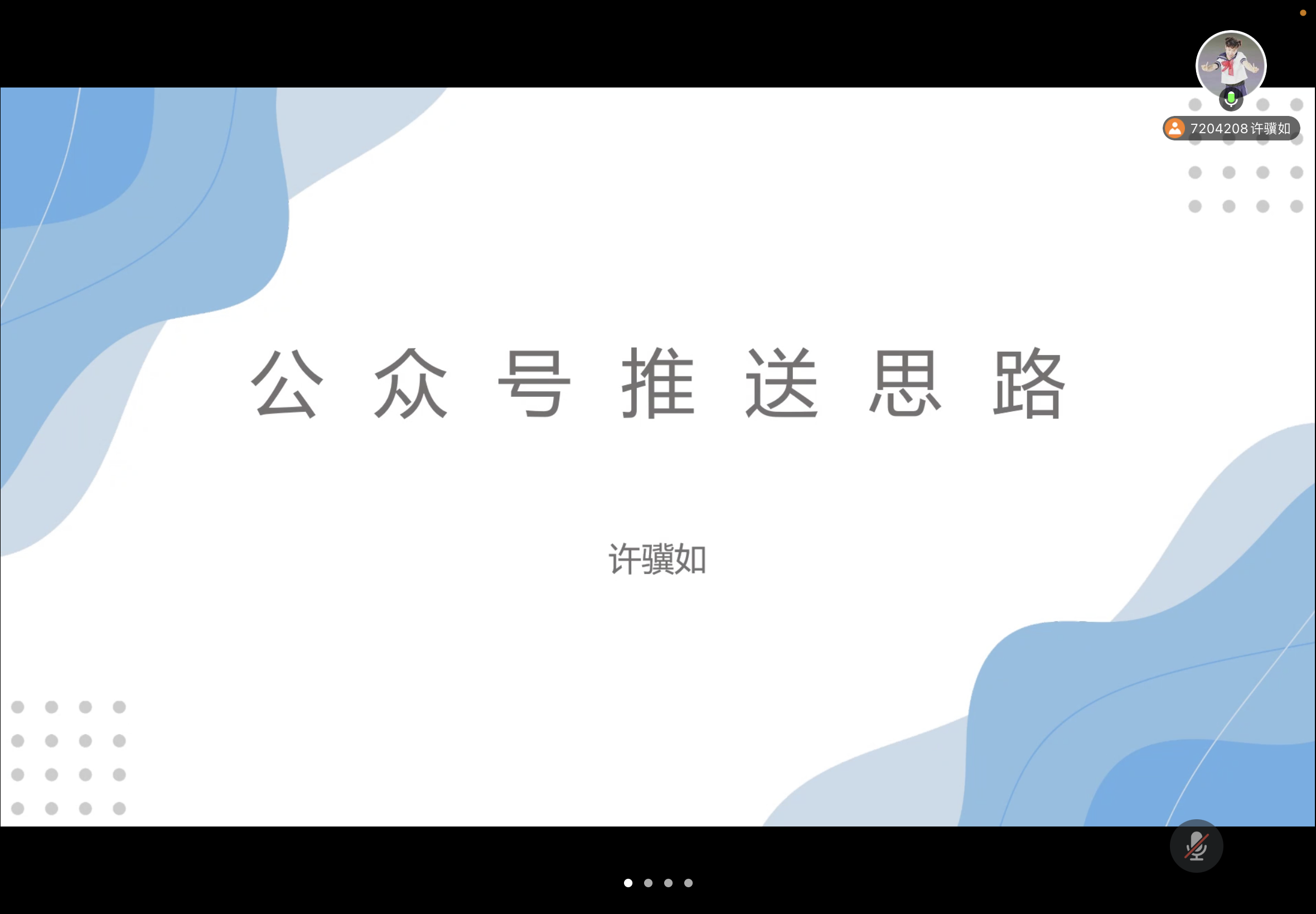 摄影部(采编二部)部长裴子焱介绍了推文选题和推文制作与发布流程。她通过屏幕共享解说了推文的选题思路,与大家分享自己的经验,并明确了推文制作分配、制作、审核、发布的流程。