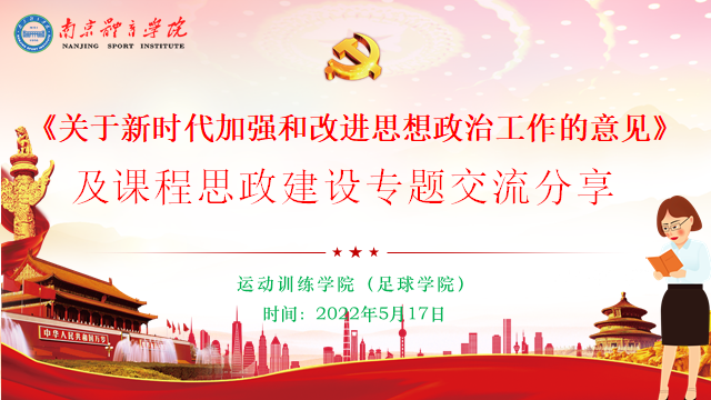 5月17日下午,运动训练学院在仙林校区组织召开学习《关于新时代加强和改进思想政治工作的意见》(以下简称《意见》)体会和课程思政建设交流分享会。分享会由学院党总支书记张亚军主持。学院全体教职工参加会议。
