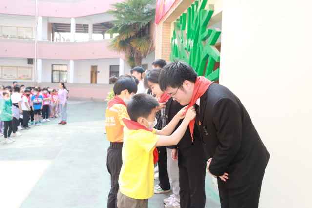 附属学校少先队员代表为大学生宣讲团成员献戴红领巾