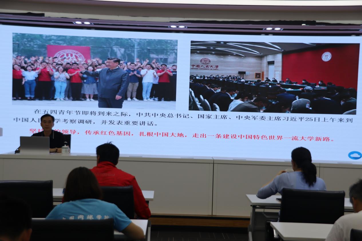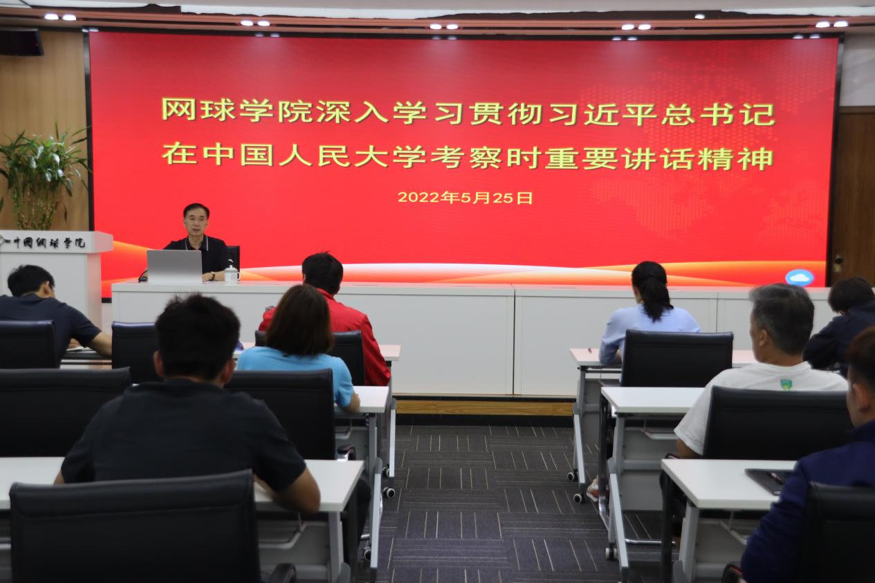 为深入学习贯彻习近平总书记重要讲话精神,根据校党委《关于深入学习贯彻习近平总书记在中国人民大学考察时重要讲话精神的通知》文件精神,网球学院直属党支部于2022年5月25日上午在国际报告厅开展学习贯彻习近平总书记在中国人民大学考察时重要讲话精神学习会。网球学院全体党员、管理干部、教练员、钟山公司全体中层干部参加会议。会议由网球学院直属党支部书记丁习明主持。