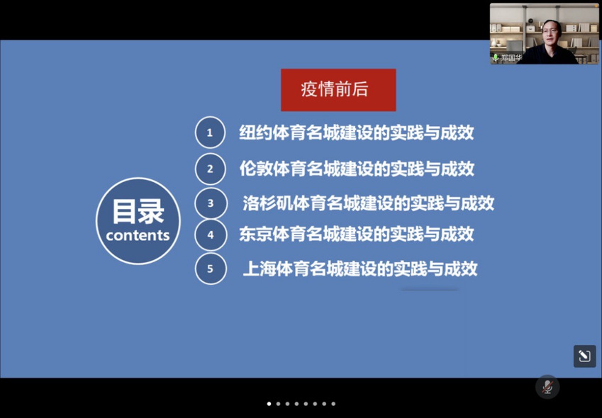 郑国华教授在讲座中梳理了近十年国内外中心城市在发展规划中提出的“建设体育城市”等目标任务,对比分析了疫情之下全球著名城市的体育影响力排名和关注热点。受疫情影响最新的全球著名体育城市排名出现了较大波动,纽约、伦敦、东京、上海等案例研究充分揭示了疫情与全球著名体育城市建设关注度转向的内在关联。报告辩证审视中外体育中心城市建设的差异和共性,对疫情之下国内外中心城市在抓住体育契机、充分发挥体育正面影响、提升城市文化国际影响、改善城市形象等方面的先进经验进行了阐释,从而为我国体育助力城市建设提供国际经验、现实途径和战略选择。