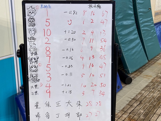 本次为期四周的测验积分赛,比赛时间设定为每周四与周五下午,分别测试100米主项、200米主项两个项目。赛事积分的获取为比赛成绩与个人最好成绩的正负值进行排序,即超过个人最好成绩或最接近个人最好成绩的运动员获得积分最多,第一名为9分,第二名为7分,第三名6分,以此类推。团队则以抽签组队选人的方式进行。