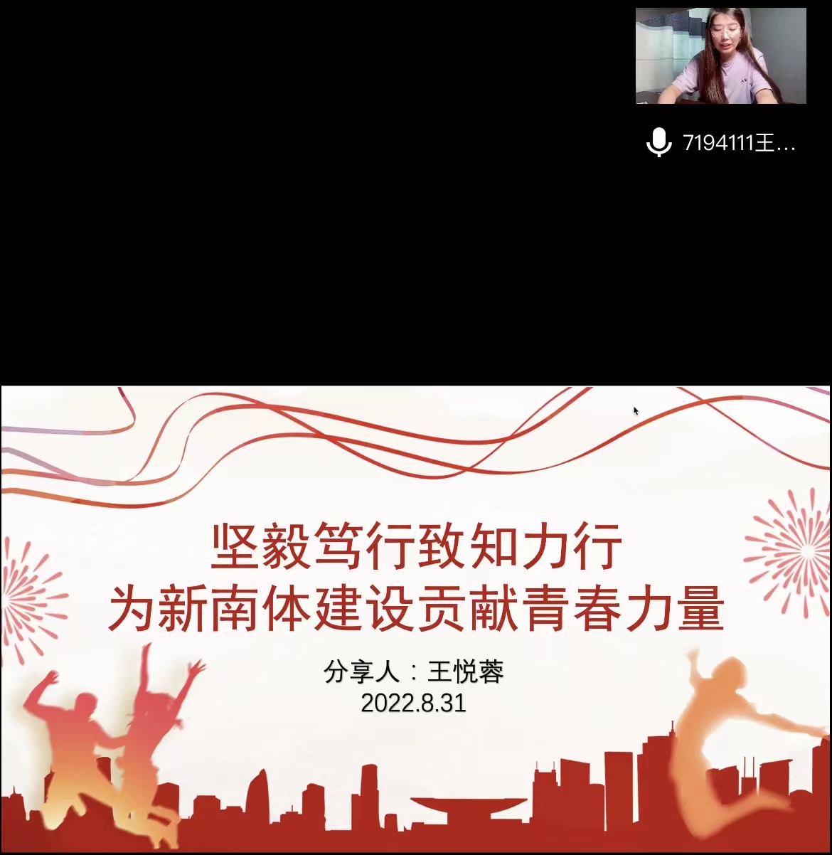 激扬青矜之志,绽放夺目光彩。为让新生了解大学生活、明确理想、未来取得更好的成绩。8月31日下午,学院举办19级新闻一班五四红旗团支部分享活动,本次线上活动由辅导员沈梦主持,2022级体育教育与人文学院全体新生参与。