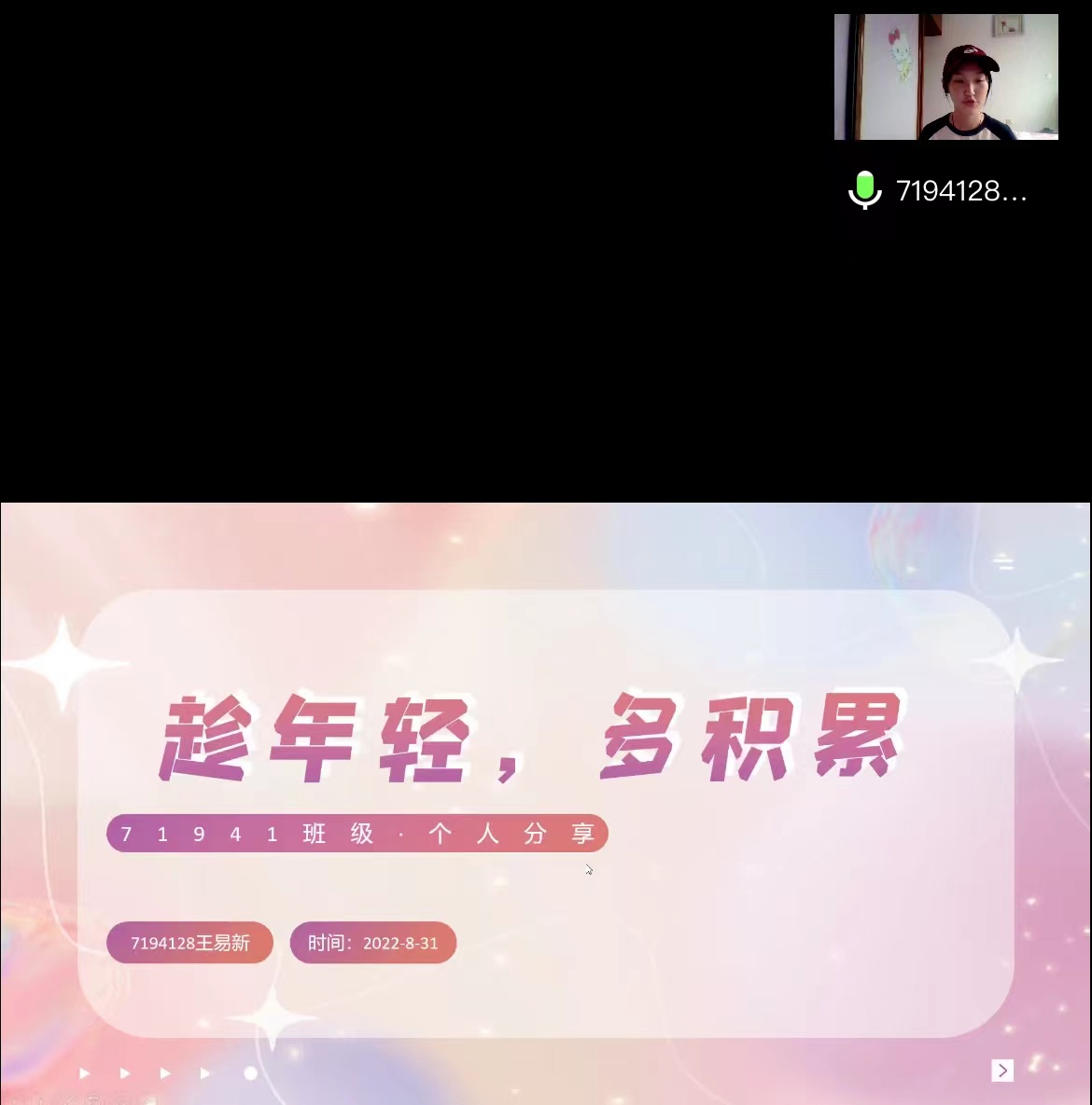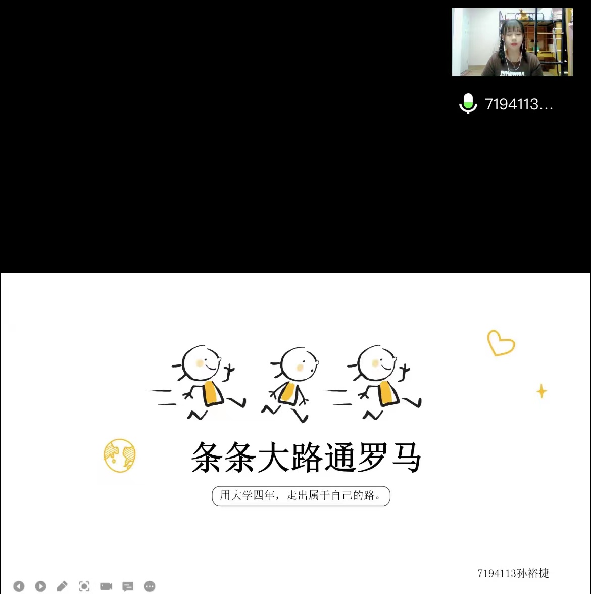 19级新闻一班班级干部和优秀个人依次分享了自己的大学生活。班级宣传委员何盈盈以自身经验呼吁新生强化理想信念,参与各项活动,丰富大学生活;班级团支书聂一畅从工作学习两不误角度上,引导新生对未来进行思考;王悦蓉以学生干部为切入视角,倡导主动抓住机会,去接触更多人和事,不断提升自己;王易新分享了自己大学生涯中的经验和在青媒的工作经历,以此劝勉新生勇于面对挫折和错误并积极改正;孙裕捷从自身的自媒体和作家的工作,证实大学生活的包容性之大和走出属于自己的道路之重;在省运会实习的王奕凯也向大家分享了自己的相关经历。