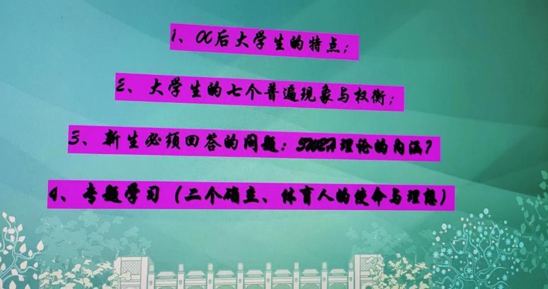 体育教育与人文学院始终将立德树人作为教育的中心环节,结合体育院校实际,深入做好新生思想政治教育工作,帮助学生筑牢信仰之基、明确奋斗方向,教育引导新生扣好大学生活的第一粒扣子,为学校和祖国发展不断奋斗。