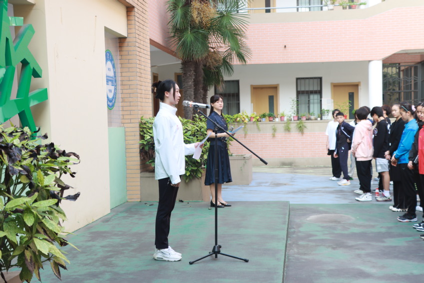 升旗手,高三年级艺术体操队江显彤同学在国旗下发言。她认为每一位学生运动员都应该将个人理想与祖国发展紧密相连。在学习上,勤学善思、多问笃行;在训练场上,顽强拼搏、勇于挑战。用汗水和泪水点燃青春、放飞梦想,报效祖国。