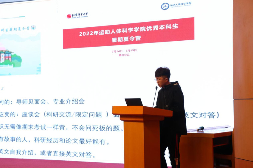 运动人体科学专业的胡慧同学和运动康复专业的程燕翔同学分别进行了学习经验的分享。两位同学表示:有目标、有自信、有动力是保证学习成绩的必要条件。胡慧同学对大二、大三学生的未来规划提出建议。程燕翔同学则从培养的良好习惯入手,讲解研究生推免的流程,分享课堂笔记的记录经验等。