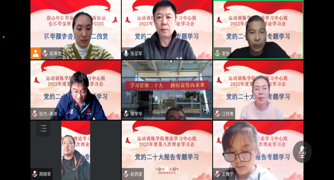 10月27日中午,运动训练学院党总支以在线方式召开理论学习中心组集体学习会,专题学习党的二十大报告,研究部署下一步学习宣传贯彻工作。学院党总支书记张亚军主持学习会。学院理论学习中心组全体成员在线参加学习。张明、王豫宁、孙苏扬、张杰、周晓军结合工作实际,进行了学习交流发言。