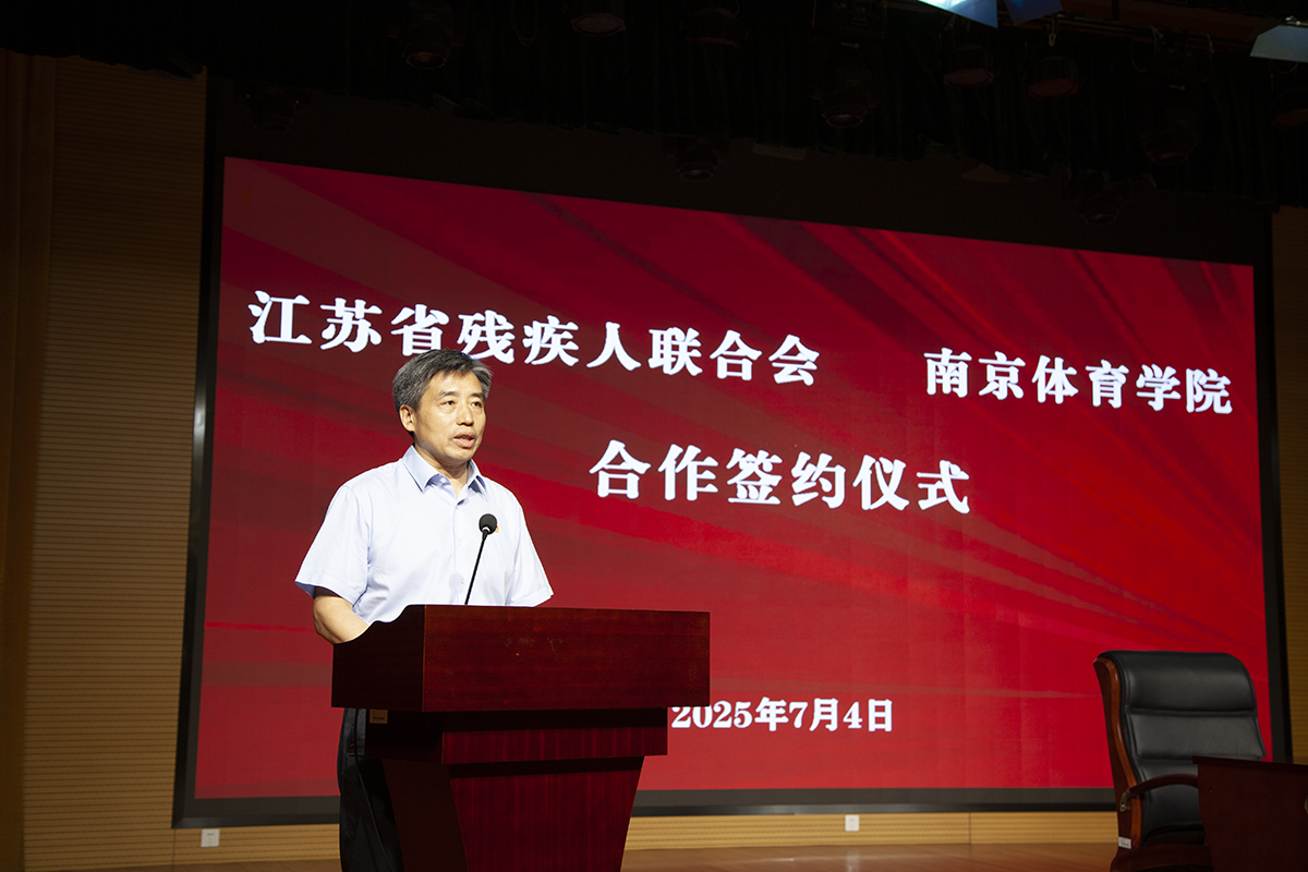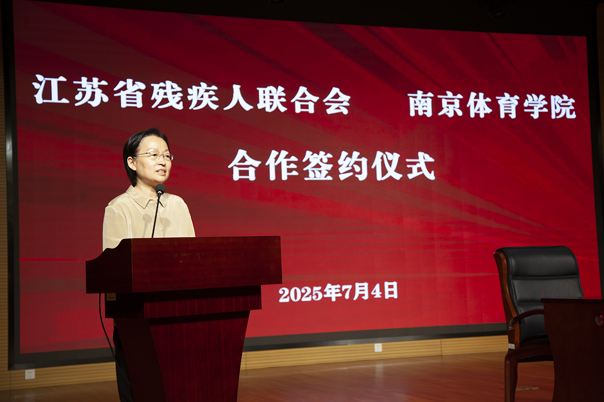 刘红明在致辞中表示,残疾人事业是中国特色社会主义事业的重要组成部分,是致力人类幸福的崇高事业。一直以来,省残联致力于服务江苏残疾人事业发展,长期深耕残疾人民生保障、改善残疾人生活品质、发展和管理残疾人事业等各领域,残疾人群众体育、康复体育广泛开展,竞技体育稳居全国前列,残奥会金牌数和奖牌数连续6届位居全国第一,得到了社会各界的高度认可。PA视讯集团入口作为江苏省唯一一所独立建制的高等体育院校,同时承担着高等教育“为党育人、为国育才”和竞技体育“为国争光、为省添彩”双重使命,先后培养了18位奥运冠军、121位世界冠军和数以万计的高水平体育人才,被誉为“世界冠军的摇篮”“体教融合的典范”。在推动体育强国、体育强省建设的新征程上,双方有共同的使命和任务,希望双方以此次战略合作为契机,持续深化“1+N+1”的合作机制,在竞技体育训练备战、残疾人体育科研与运动康复、教育教学与实习实训等方面开展全面务实的合作,共享资源、共谋发展、共赢未来,为推动江苏省残疾人体育事业高质量发展作出积极贡献。