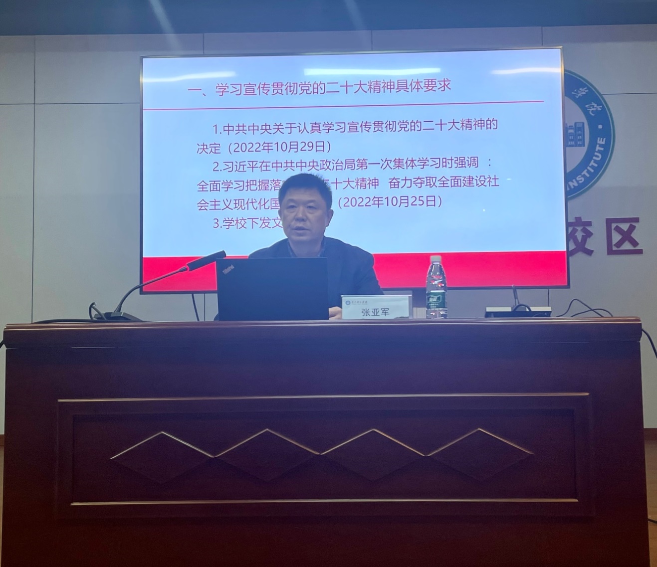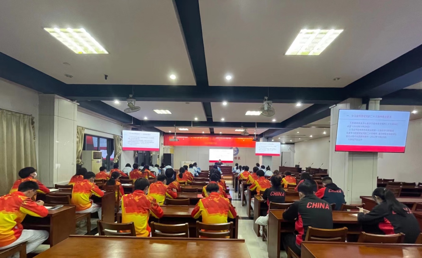 张亚军以“踔厉奋发 勇毅前行——党的二十大精神专题学习”为题,用《中共中央关于认真学习宣传贯彻党的二十大精神的决定》开篇明义,以党的二十大报告要点为主线,重点从“党的二十大基本情况及取得成效”“党的二十大主题”“新时代10年,我们经历了对党和人民事业具有重大现实意义和深远历史意义的三件大事”等方面对二十大精神的丰富内涵和核心要义进行了解读。张亚军领学了习近平总书记有关青年工作的系列重要论述,特别着重从二十大报告有关寄语广大青年的内容,结合实际工作同大家一起深入学习党的二十大精神。专题党课最后,张亚军对学院全体学生学习贯彻党的二十大精神提出要求,对运动训练学院落实学校有关疫情防控、校园安全稳定工作要求进行了部署。