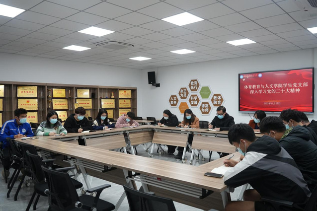 《关于认真学习宣传贯彻党的二十大精神的决定》指出学习宣传党的二十大精神是当前和今后一个时期全党全国的首要政治任务。为深入学习宣传贯彻党的二十大精神,11月25日,体育教育与人文学院学生党支部在教学办公楼220会议室,召开深入学习党的二十大精神学习会,学院党总支副书记卢奎出席会议,学院各年级辅导员、学生骨干和部分党员参会。会议由高强领学。