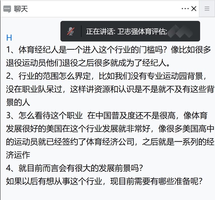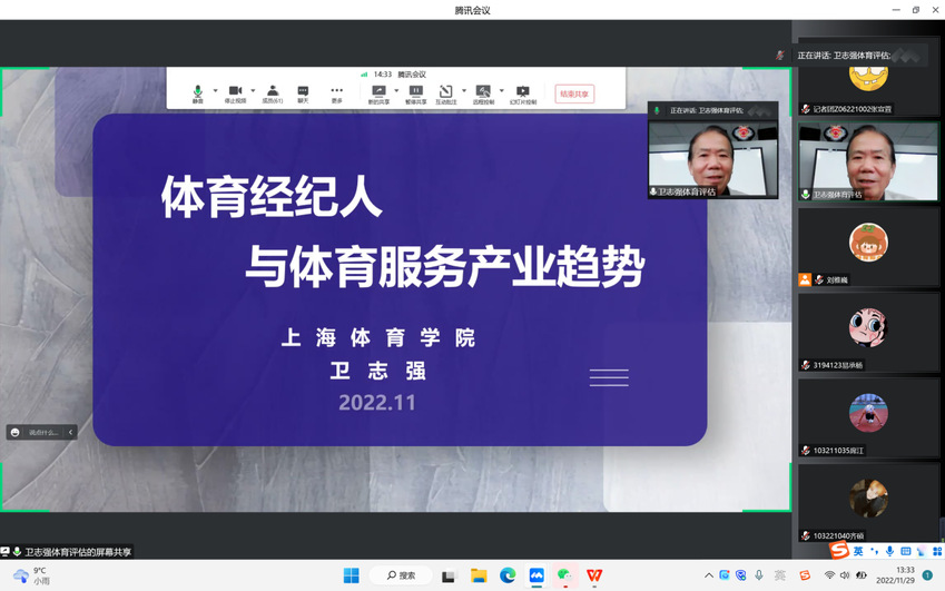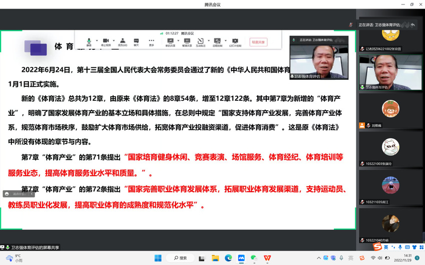 卫志强教授立足自身职业优势,从“体育经纪人与培训”和“体育服务产业”两个角度展开讲述。通过梳理我国体育经纪人职业的发展脉络,明确体育经纪人培训的宗旨,从学员、教材、考试、测评等方面进行了细致的讲解,让同学们对我国体育经纪人入职门槛有了清晰的认识。随后,卫教授又以2022年6月新修订后的《中华人民共和国体育法》为切入点,结合2022年北京冬奥会,通过多名国内体育经纪人和体育院校大学生就业的成功案例,对体育产业未来的发展做了非常专业和具有前瞻性的剖析和分享。