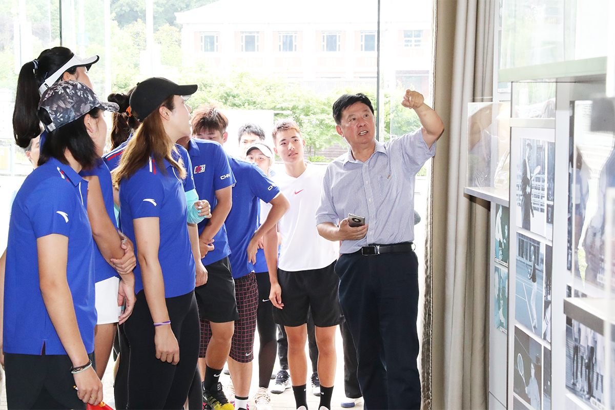 授课结束后,蒋宏伟带领现场全体运动员、教练员、管理干部走进“吕正操与网球”展示厅,利用丰富的图文及实物展品开展党史实践教学。