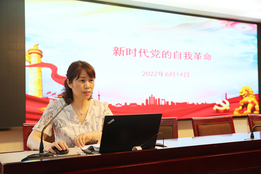 校党委常委、纪委书记、派驻监察专员潘林珍在会上作题为《新时代党的自我革命》的领学讲话,从历史和现实两个维度对“自我革命”进行了讲解。她指出,坚持自我革命是我们党百年奋斗的十条历史经验之一,自我革命精神是党保持生机活力的源泉。新时代党的自我革命主要包括丰富和发展马克思主义、全面深化改革、全面从严治党和反腐败斗争等三项重大工程。