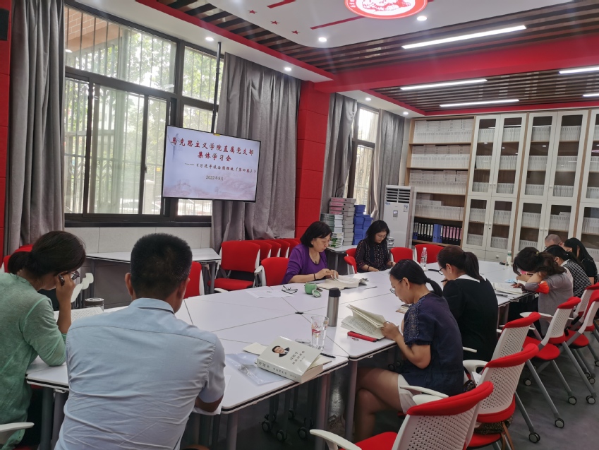 9月1日下午,马克思主义学院直属党支部在思政课教学实践中心召开集体学习会,学深悟透近平总书记在省部级主要领导干部专题研讨班上的重要讲话精神,深入学习《习近平谈治国理政》第四卷。会议由马克思主义学院直属党支部书记葛翠柏主持,支部全体党员参加了交流学习。