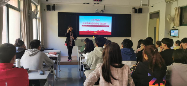 10月20日上午,马克思主义学院葛翠柏老师在《党史》课堂上,为新闻学22级1班学生讲授二十大专题思政课。葛翠柏老师以提问学生观看党的二十大开幕会感受为开场,并针对学生的疑问从习近平总书记在开幕会上报告内容的十五个方面带领学生全面、系统地了解二十大精神的内涵。并号召广大青年大学生要坚定不移听党话、跟党走,怀抱梦想又脚踏实地,敢想敢为又善作善成,立志做有理想、敢担当、能吃苦、肯奋斗的新时代好青年,让青春在全面建设社会主义现代化国家的火热实践中绽放绚丽之花。