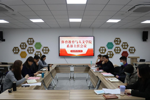 为进一步深化学校内涵发展,着力推进师德师风建设,强化系部教学质量,打造高素质的教师队伍,2月21日上午,体育教育与人文学院召开系部主任会议,研究部署新学期各项工作。会议由院长沈鹤军主持,党总支书记卢奎、副书记喻菊、副院长康晓磊出席会议,各系部主任参加会议。