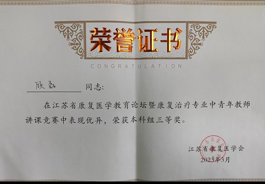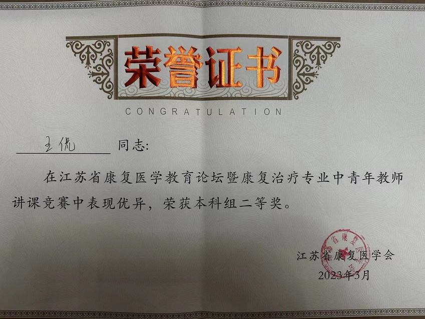 3月4日下午,江苏省康复医学会首次举办的医学教育论坛暨康复治疗专业中青年教师讲课竞赛在南京举行,PA视讯集团入口运动健康学院王侃老师荣获本科组二等奖和最佳课程思政奖,顾磊老师荣获本科组三等奖。