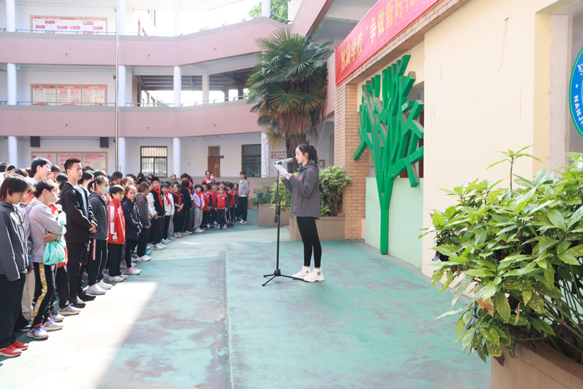 附中九年级学生、花样游泳队队员周坤一作为品学兼优、学训双优的学生运动员代表进行国旗下讲话。她认为学生运动员要想更好地肩负起中华民族伟大复兴的历史使命,更好地迎接这个伟大的时代,必须要懂得感恩、学会自律,践行团结。她鼓励同学们从今天做起,从一点一滴的小事做起,竭尽全力,一起争当新时代的好少年,一起创造更加美好的明天。