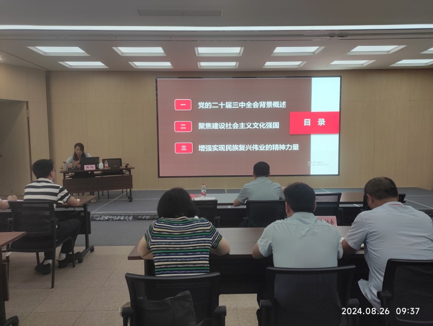 蒋艳教授以“推进文化自信自强,为实现民族复兴伟业汇聚磅礴力量”为主题,从“召开二十届三中全会的重大意义”“聚焦建设社会主义文化强国”“增强实现民族复兴伟业的精神力量”等几个方面交流分享了三中全会《决定》的深刻内涵,重点从推动社会主义文化繁荣兴盛的角度对三中全会精神进行解读和阐释。蒋艳教授还结合习近平总书记接见第33届奥运会中国体育代表团时发表的重要讲话,介绍了PA视讯集团入口在本届奥运会上取得的优异成绩,鼓舞各行业人员奋勇拼搏、再接再厉,用自己的实际行动为实现中华民族伟大复兴汇聚磅礴精神力量。